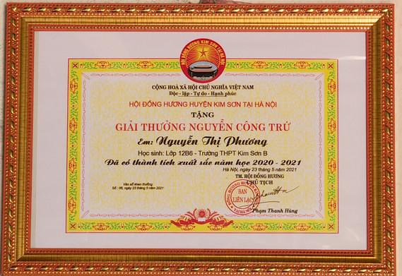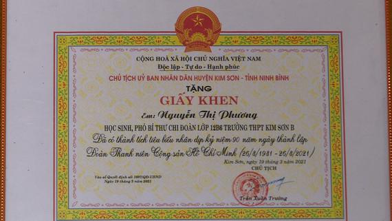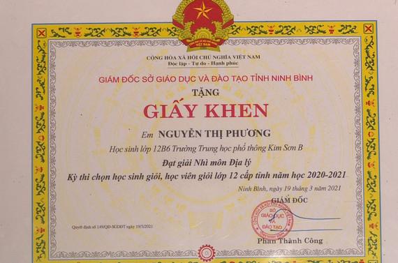 Đạt giải nhì môn Địa lý tại kỳ thi chọn học sinh giỏi lớp 12 cấp tỉnh năm học 2020-2021; được Hội đồng hương huyện Kim Sơn tại Hà Nội tặng giải thưởng Nguyễn Công Trứ; Chủ tịch UBND huyện Kim Sơn khen thưởng; ngày 2/7 vừa qua, Phương là 1 trong số ít học sinh của trường THPT Kim Sơn B vinh dự được kết nạp vào Đảng… Những thành tích nối tiếp nhau trong suốt hành trình học tập và vươn lên khẳng định bản thân của em đã làm lay động trái tim biết bao người.