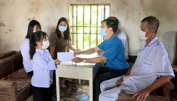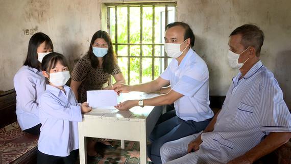 Ông Trịnh Duy Nghĩa, Chủ tịch Công đoàn Ngành Giáo dục Ninh Bình và nhà hảo tâm trao quà, động viên em Phương.