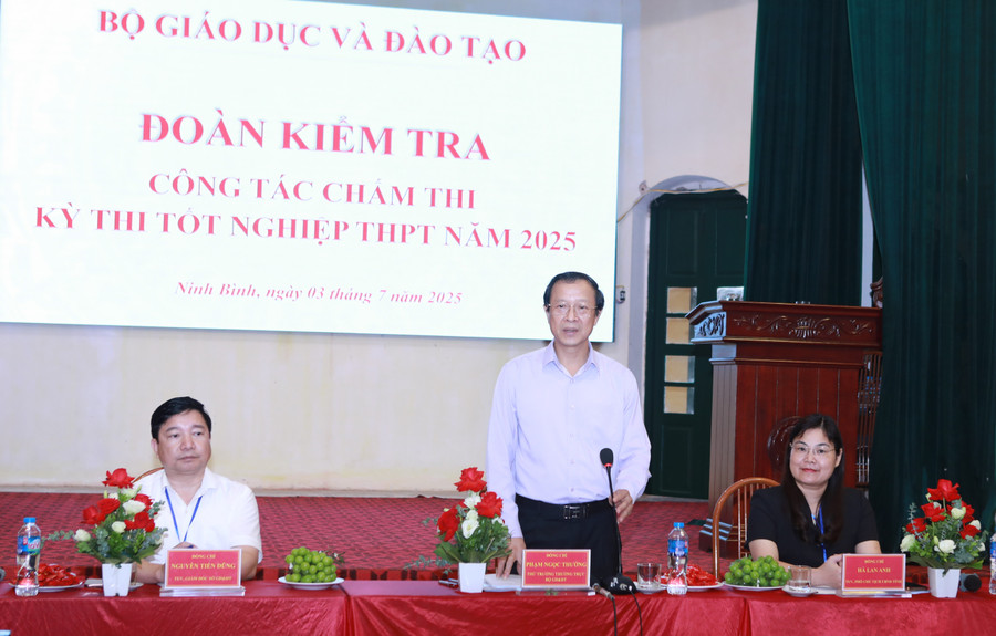 Sáng 3/7, đoàn công tác của Bộ GD&ĐT do Thứ trưởng Phạm Ngọc Thưởng dẫn đầu làm việc tại Hội đồng chấm thi số 2, Hội đồng thi tỉnh Ninh Bình đặt tại Trường THPT Nguyễn Khuyến – phường Nam Định. Cùng dự có lãnh đạo Cục Quản lý chất lượng, đại diện Thanh tra Chính phủ, Vụ Giáo dục phổ thông và một số đơn vị liên quan.