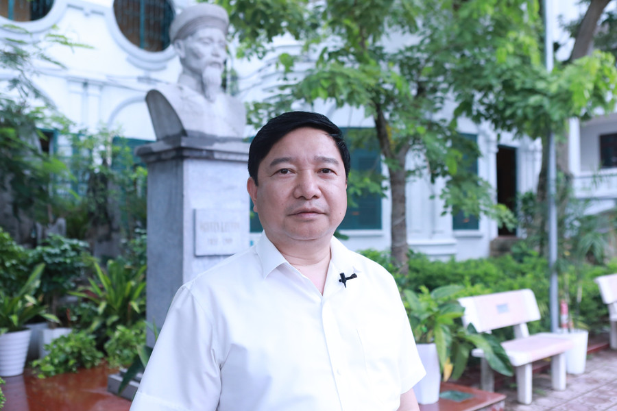 Ông Nguyễn Tiến Dũng, Giám đốc Sở GD&ĐT Ninh Bình trao đổi một số thông tin về công tác chấm thi tốt nghiệp THPT 2025 trên địa bàn tỉnh sau sáp nhập. Ảnh: Đình Tuệ.