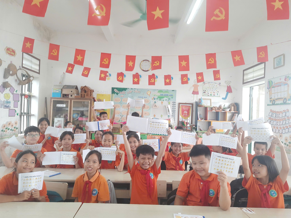 Hình ảnh các em sung sướng dán Stiker vào Sổ tay phần thưởng của mình