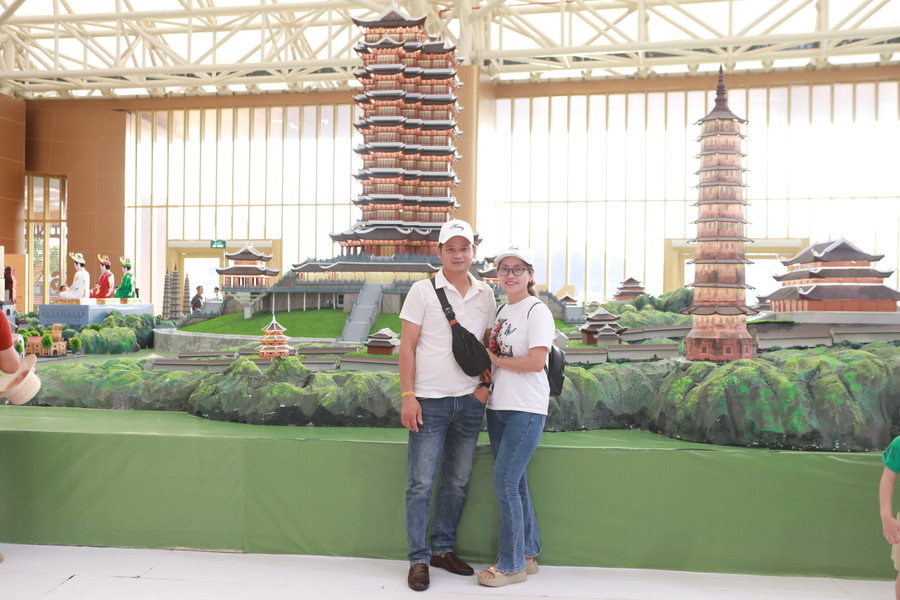 Nhiều du khách “check-in” tại mô hình Chùa Bái Đính trưng bày trong khu triển lãm. Ảnh: Đình Tuệ.