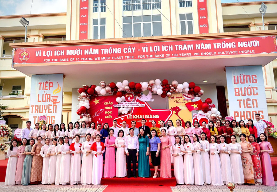 Các đại biểu, thầy cô tại Lễ khai giảng năm học mới 2025-2026 tại Trường Tiểu học Trần Nhân Tông, phường Đông A, tỉnh Ninh Bình.