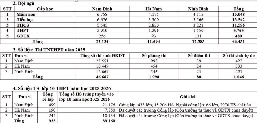 Tại Hà Nam, trước khi sáp nhập toàn tỉnh có 11.694 giáo viên các cấp học; 51.892 trẻ mầm non; 116 trường Tiểu học với 76.717 học sinh; 110 trường THCS với 61.293 học sinh; 26 trường THPT với 24.336 học sinh; 6 Trung tâm GDNN-GDTX với 6.490 học viên.