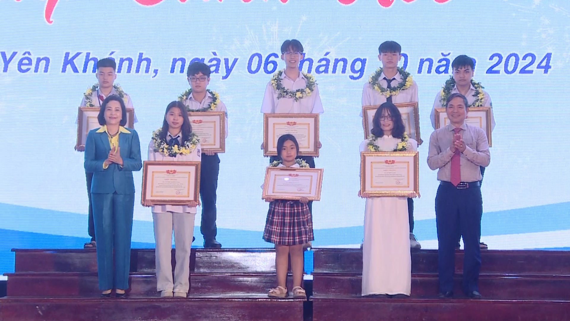 Đồng chí Phó Chủ tịch Quốc hội Nguyễn Thị Thanh và đồng chí Chủ tịch Hội Nông dân tỉnh, nguyên Bí thư Huyện ủy Yên Khánh Hoàng Văn Thắng trao thưởng cho các em học sinh đoạt giải cấp Quốc gia trong kỳ thi chọn học sinh giỏi do Bộ GD&ĐT tổ chức, học sinh đoạt huy chương vàng trong các cuộc thi Olympic do các tổ chức quốc tế tổ chức.
