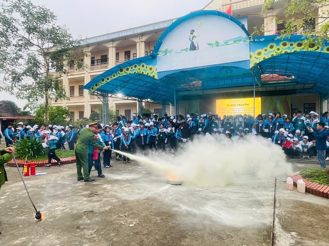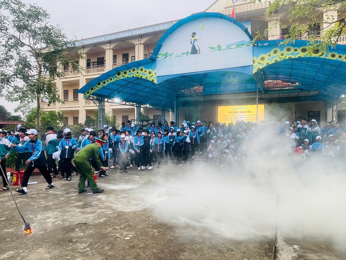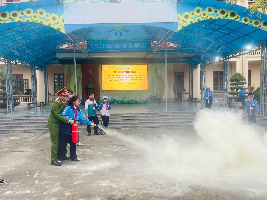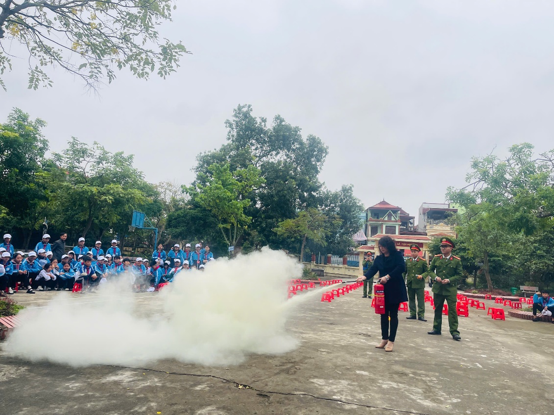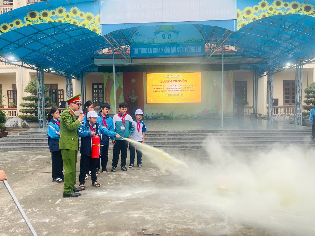 Không chỉ dừng lại ở lý thuyết, phần được mong chờ nhất và cũng là điểm nhấn của buổi tuyên truyền chính là phần thực hành kỹ năng PCCC. Dưới sự giám sát và hướng dẫn trực tiếp của các chiến sĩ công an, các em học sinh và cả các thầy cô giáo đã được “mắt thấy, tay làm” – trực tiếp sử dụng bình chữa cháy để dập tắt một đám cháy giả lập.
