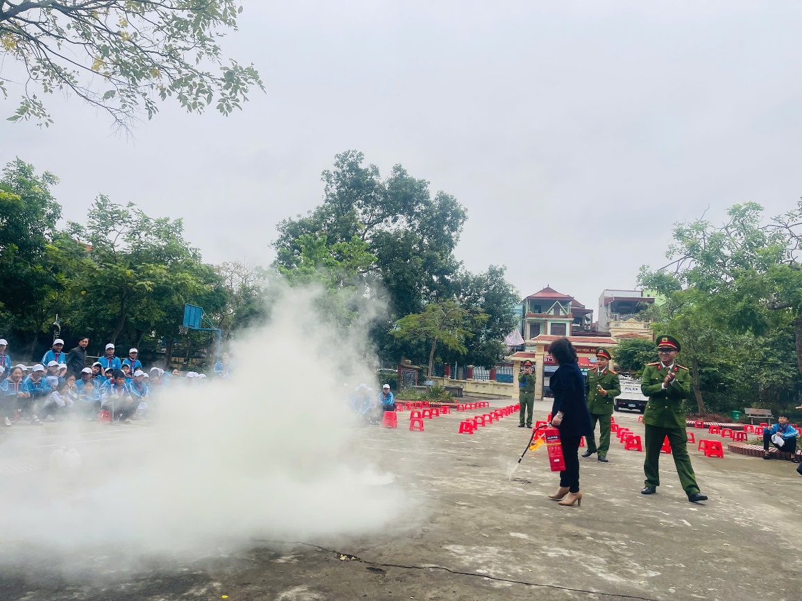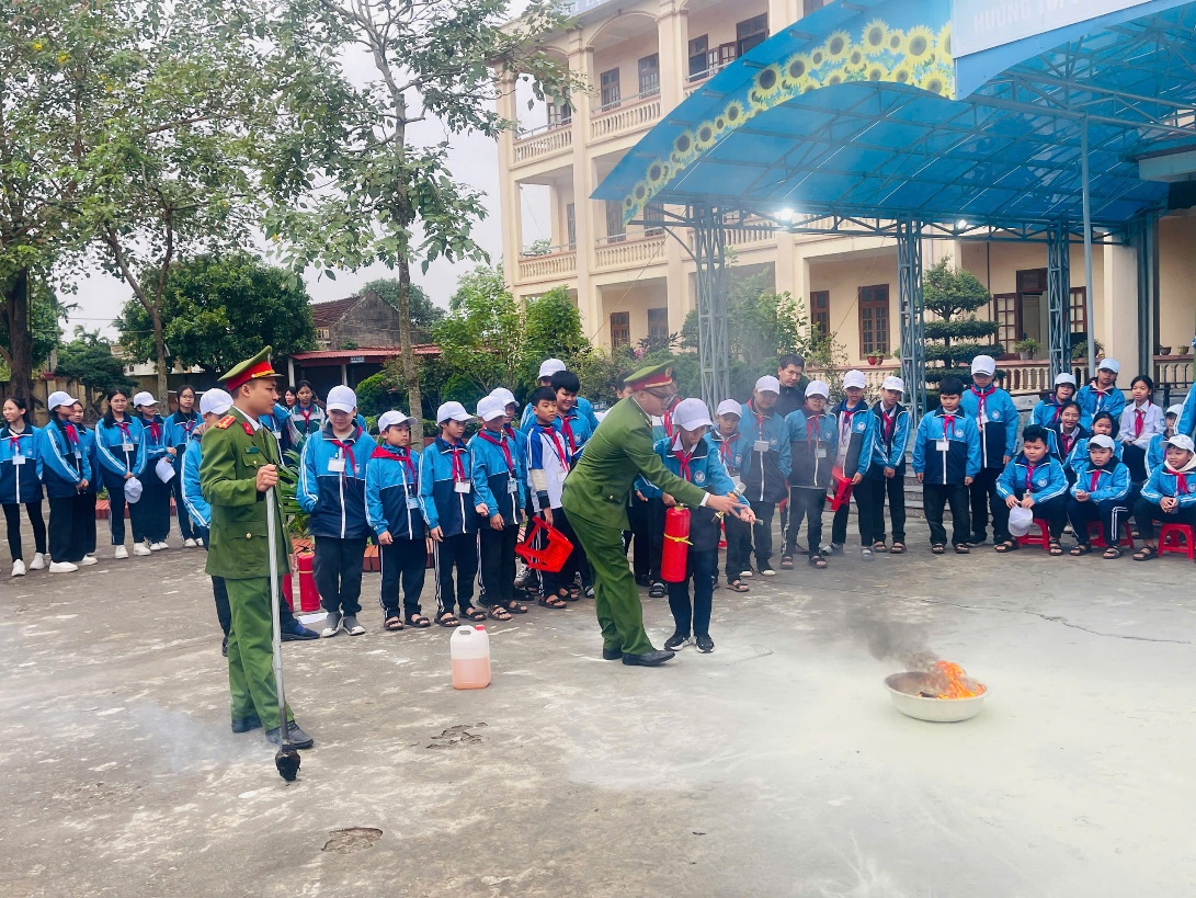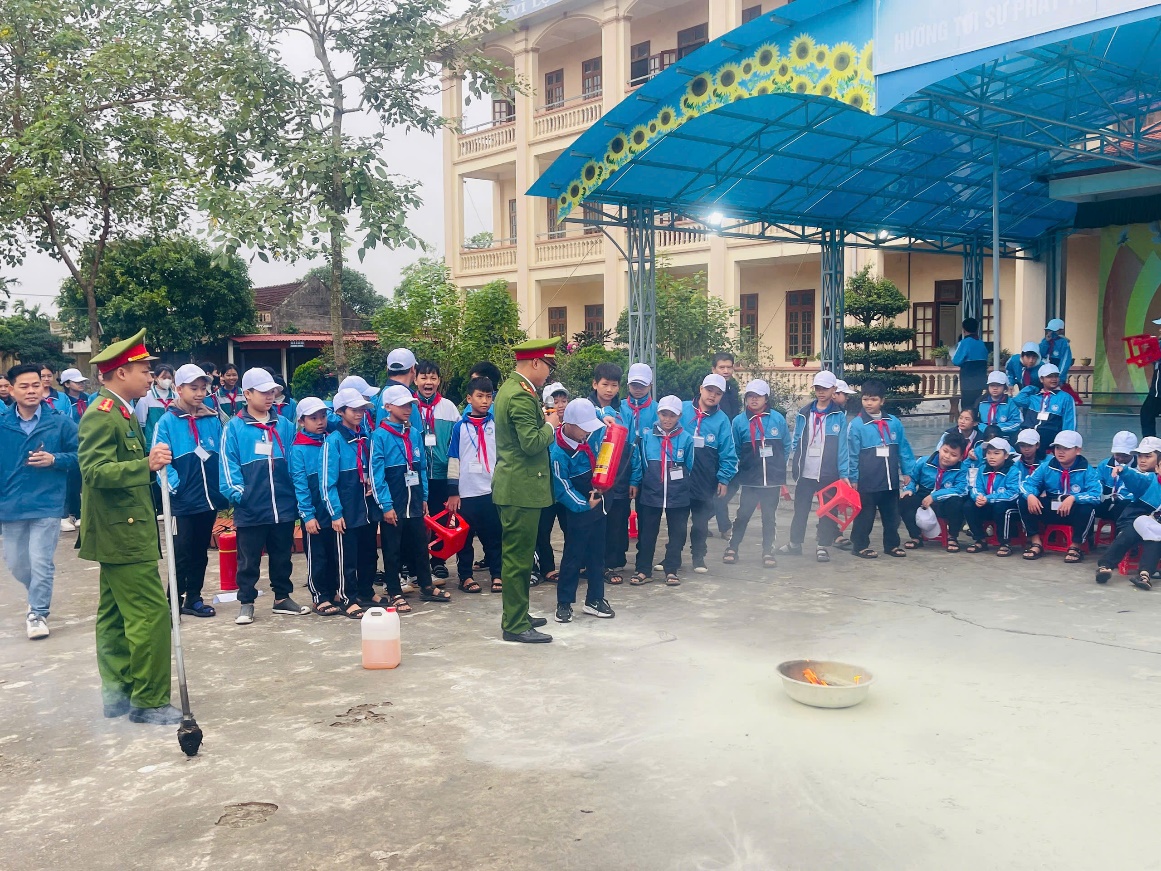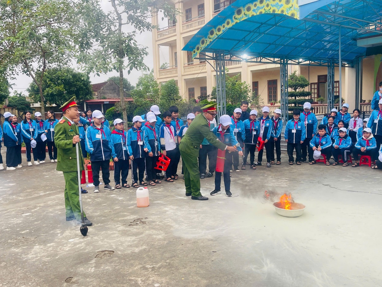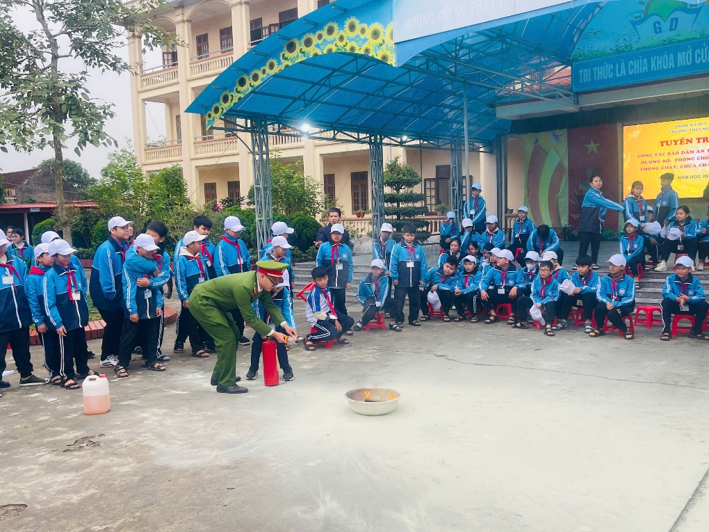 Không chỉ dừng lại ở lý thuyết, phần được mong chờ nhất và cũng là điểm nhấn của buổi tuyên truyền chính là phần thực hành kỹ năng PCCC. Dưới sự giám sát và hướng dẫn trực tiếp của các chiến sĩ công an, các em học sinh và cả các thầy cô giáo đã được “mắt thấy, tay làm” – trực tiếp sử dụng bình chữa cháy để dập tắt một đám cháy giả lập.