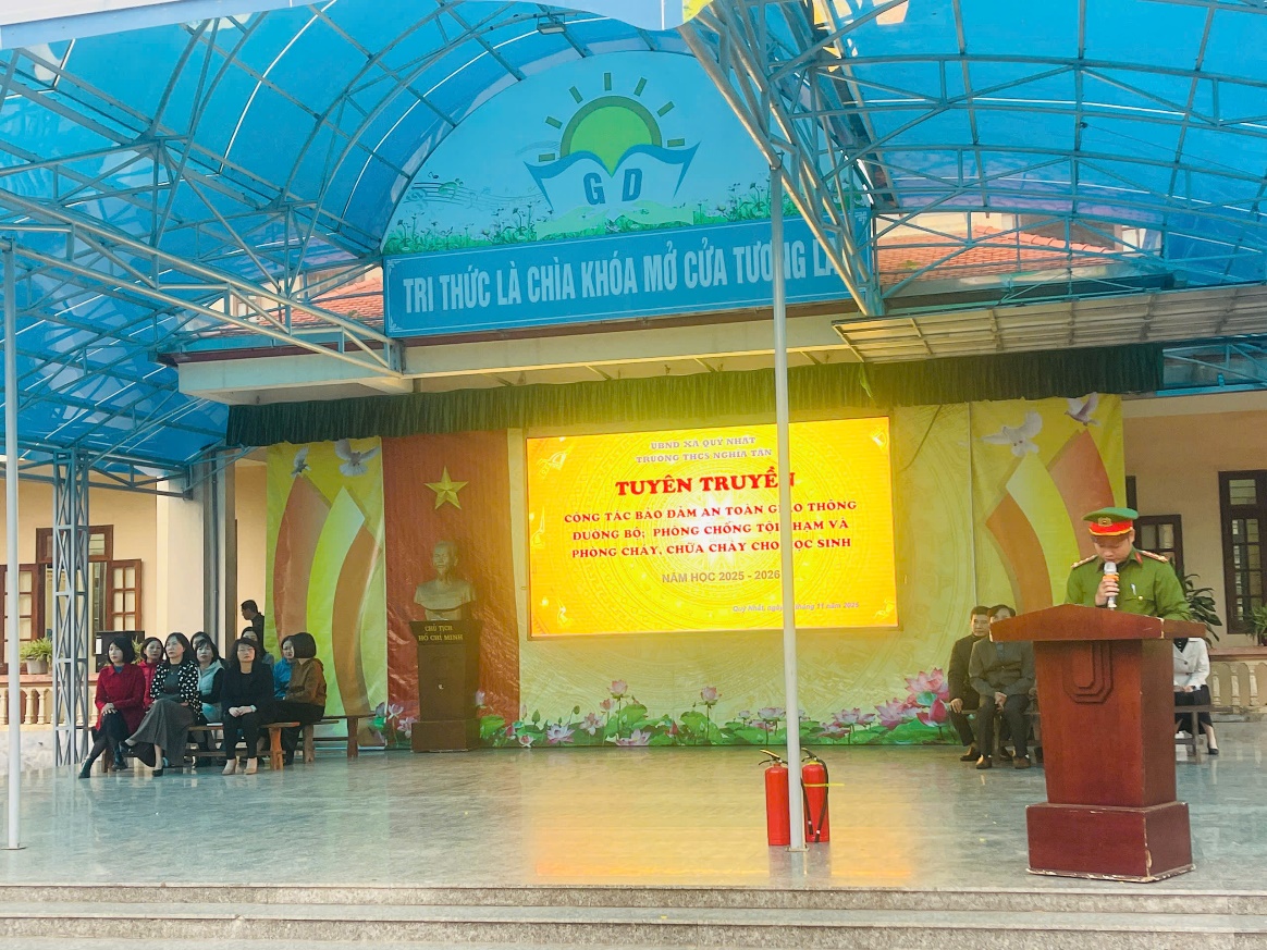 “Tri thức là chìa khóa mở cửa tương lai” nhưng tri thức đó phải đi liền với sự an toàn. Nhận thức sâu sắc điều này, sáng ngày 03/11/2025, Trường THCS Nghĩa Tân đã phối hợp với Công an xã Quỹ Nhất, tỉnh Ninh Bình tổ chức buổi sinh hoạt dưới cờ với chủ đề: “Tuyên truyền pháp luật về An toàn giao thông, Phòng chống tội phạm và Phòng cháy chữa cháy” cho toàn thể cán bộ, nhân viên và học sinh nhà trường.