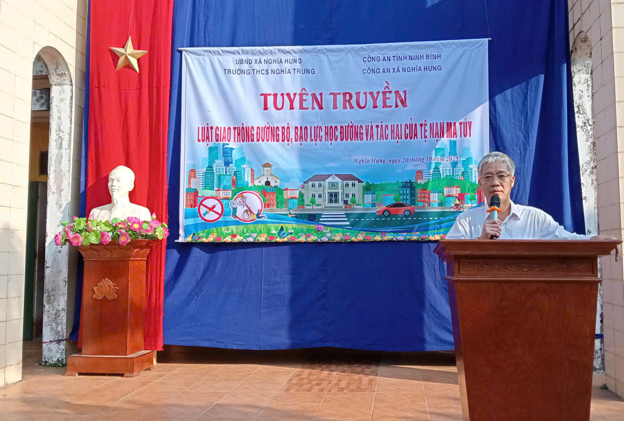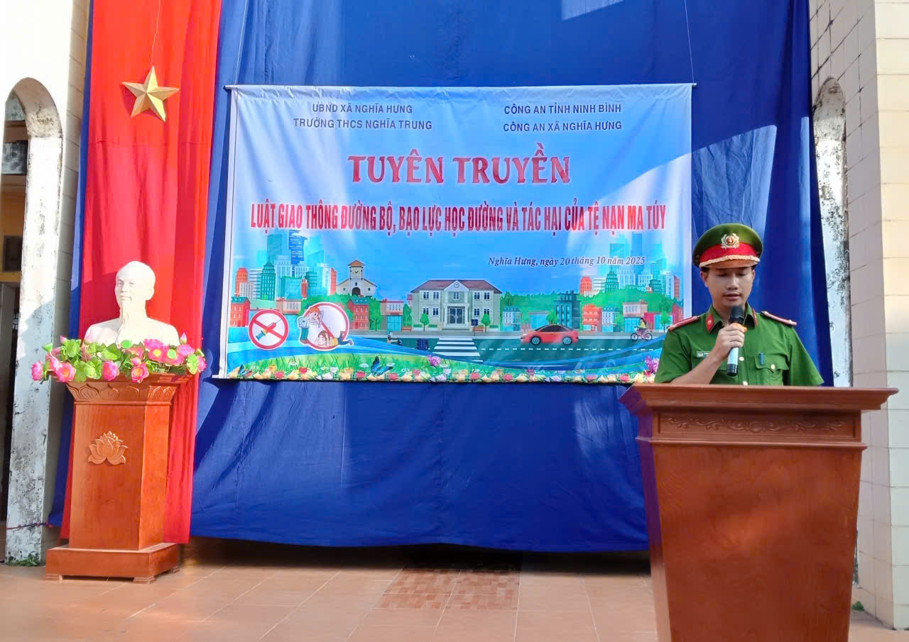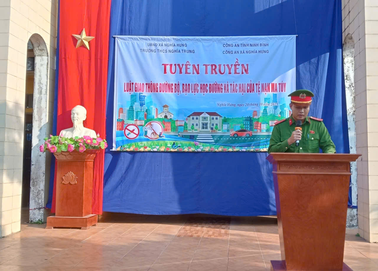 Thực hiện kế hoạch phối hợp giữa UBND xã Nghĩa Hưng, Công an xã Nghĩa Hưng và Trường THCS Nghĩa Trung, sáng ngày 20 tháng 10 năm 2025, tại sân trường THCS Nghĩa Trung đã diễn ra buổi tuyên truyền pháp luật với chủ đề: “Luật Giao thông đường bộ, Bạo lực học đường và Tác hại của tệ nạn ma túy”.