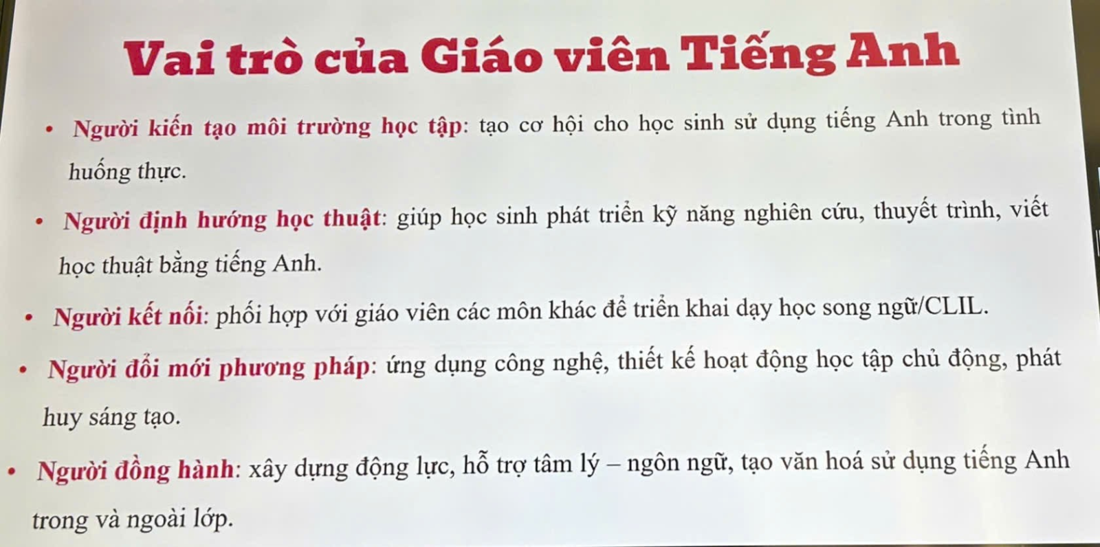 Sau buổi tập huấn, Ban giám hiệu và giáo viên tiếng Anh của nhà trường sẽ tích cực triển khai, áp dụng các nội dung đã được học tập, nhằm nâng cao chất lượng giảng dạy tiếng Anh, tạo môi trường học tập tích cực và hiệu quả cho học sinh, đáp ứng yêu cầu đổi mới của ngành giáo dục, từng bước đưa Tiếng Anh trở thành ngôn ngữ thứ 2 trong các trường học ở Việt Nam.