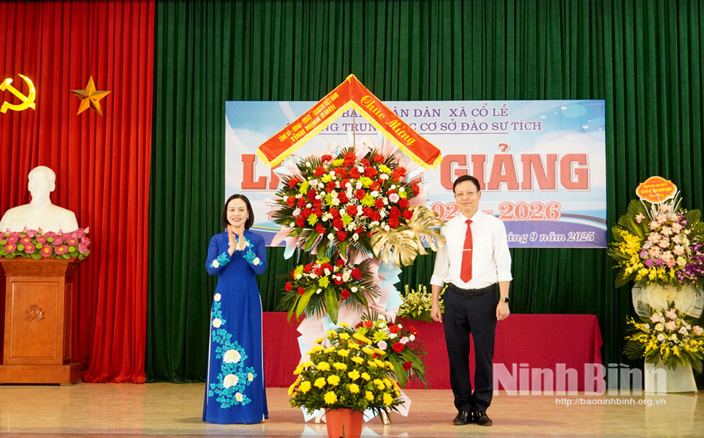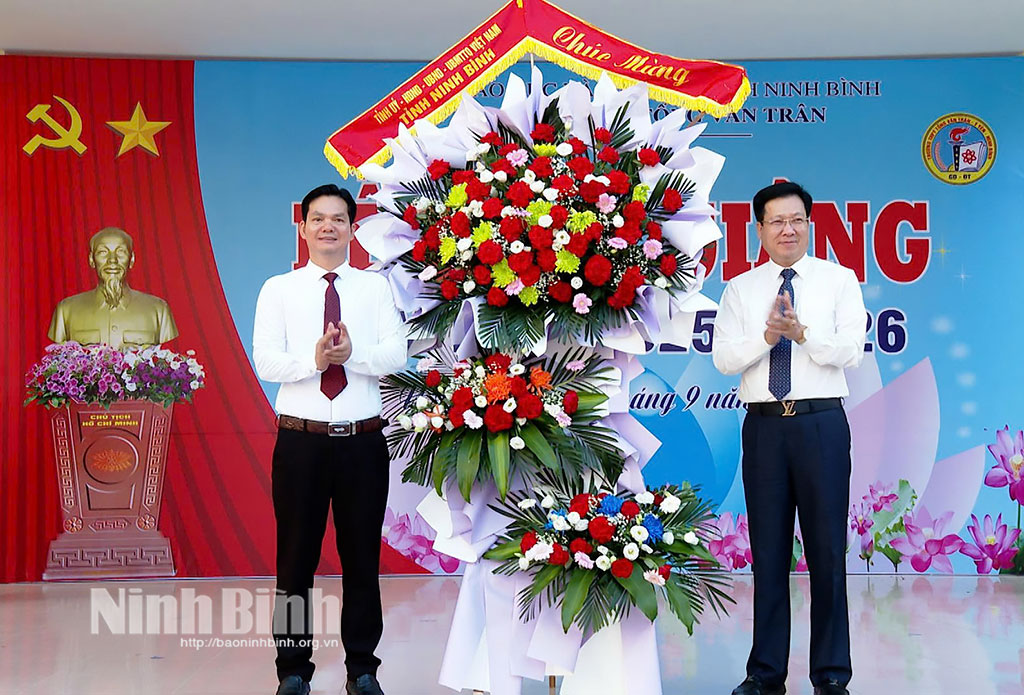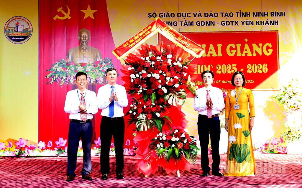 Tại lễ khai giảng, đồng chí Hoàng Nguyên Dự, Ủy viên Ban Thường vụ Tỉnh ủy, Phó Bí thư chuyên trách Đảng ủy các cơ quan Đảng tỉnh đã tặng hoa chúc mừng thày, trò Trường THPT Yên Khánh A.
