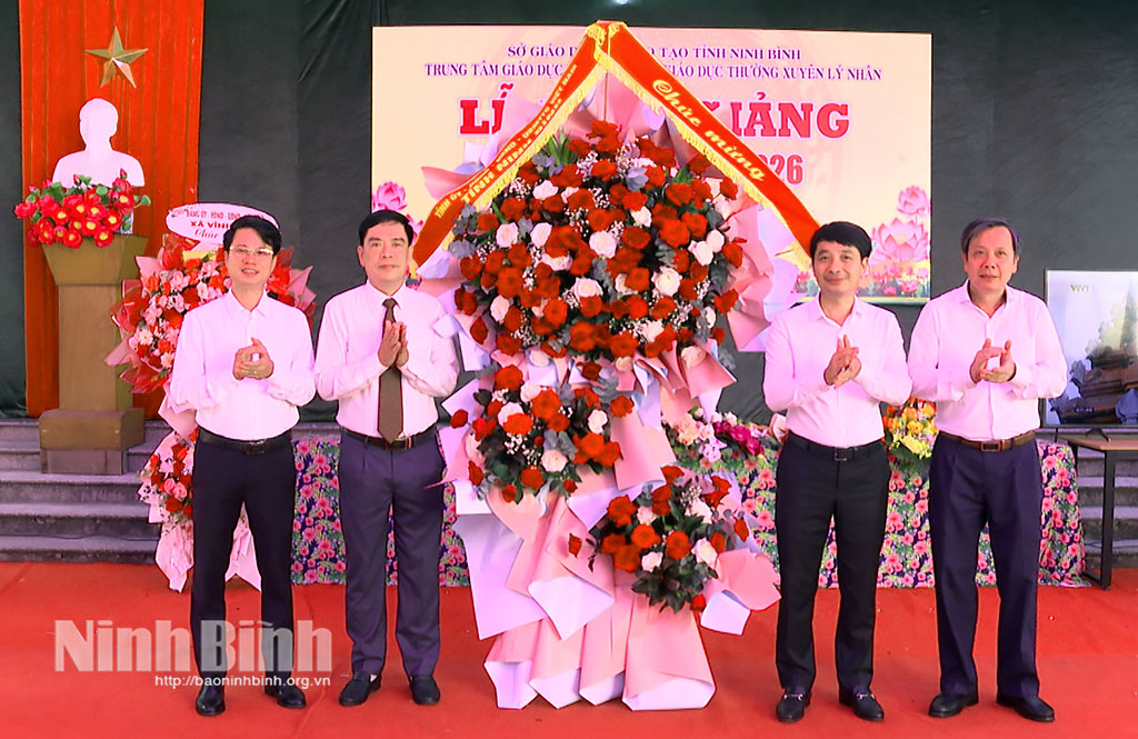 Đồng chí Phạm Duy Hưng, Ủy viên Ban Thường vụ Tỉnh ủy, Chánh Văn phòng Tỉnh ủy tặng hoa chúc mừng thầy và trò Trung tâm Giáo dục Nghề nghiệp – Giáo dục Thường xuyên Yên Khánh. Ảnh: Minh Đường