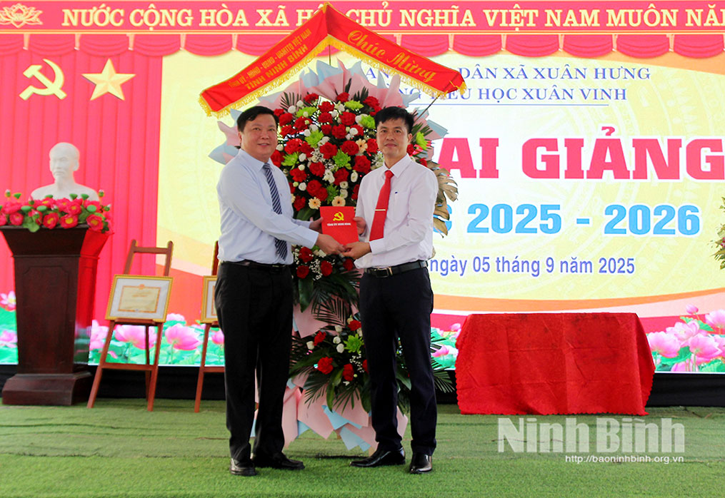 Đồng chí Phạm Hùng Thắng, Tỉnh ủy viên, Phó Trưởng Đoàn đại biểu Quốc hội tỉnh tặng hoa chúc mừng Trường Tiểu học Xuân Vinh nhân dịp năm học mới.
