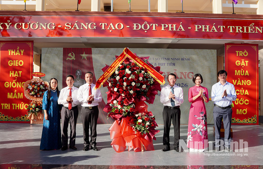 Đồng chí Nguyễn Hải Dũng, Tỉnh ủy viên, Phó trưởng Đoàn đại biểu Quốc hội tỉnh đã tặng hoa chúc mừng thầy, cô giáo và học sinh Trường THPT Duy Tiên A.