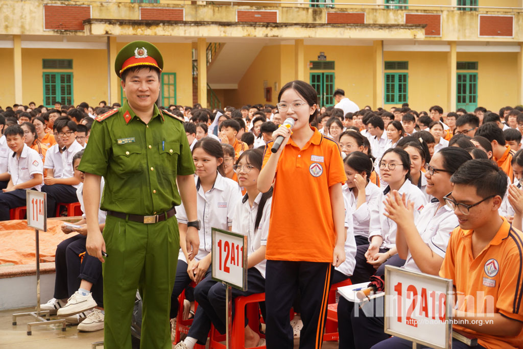 Cán bộ Công an phường Nam Định đặt các câu hỏi thiết thực thu hút học sinh tham gia tương tác.