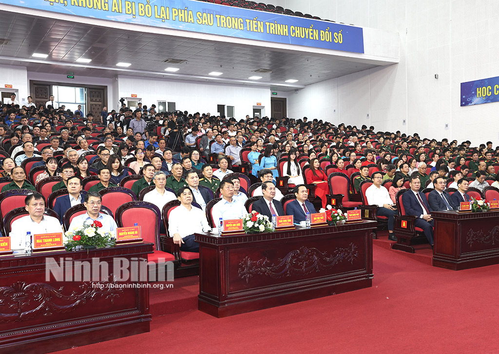 Lực lượng vũ trang tỉnh tiếp tục là lá chắn vững chắc, vừa đi đầu ứng dụng công nghệ số trong quản lý, điều hành, vừa bảo vệ người dân an toàn trên không gian mạng. Cộng đồng doanh nghiệp, doanh nhân hãy là động lực của đổi mới sáng tạo. Chủ động ứng dụng công nghệ số, trí tuệ nhân tạo để nâng cao năng suất, tạo ra các sản phẩm, dịch vụ mới, đưa thương hiệu Ninh Bình vươn xa. Ngành giáo dục, các thầy cô giáo, các em học sinh, sinh viên hãy là những người làm chủ tương lai. Đẩy mạnh dạy và học kỹ năng số, biến công nghệ thành công cụ đắc lực để học tập, nghiên cứu và sáng tạo không ngừng.