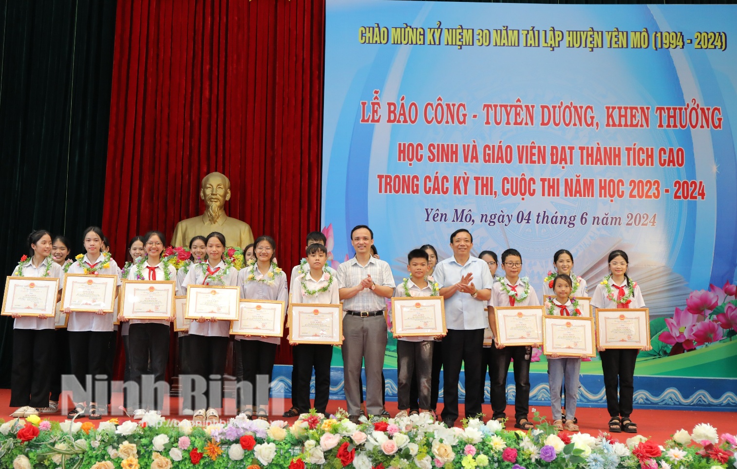 Tại hội nghị, có 13 tập thể, 34 giáo viên, gần 100 học sinh được UBND huyện Yên Mô tặng giấy khen về những thành tích xuất sắc đã đạt được trong các cuộc thi, giao lưu cấp tỉnh, cấp quốc gia và trong công tác bồi dưỡng học sinh giỏi năm học 2023-2024.